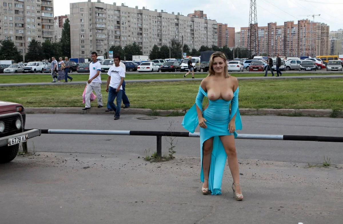 Она шла по оживленной улице, ее длинное платье из легкой, полупрозрачной ткани колыхалось на ветру, словно вторя ритму ее бедер. Грудь, полная и упругая, с тяжелыми, налитыми сосками, выпирала над тонким материалом, притягивая редкие взгляды прохожих. Без трусов под юбкой она чувствовала себя обнаженной богиней в толпе смертных — каждый шаг заставлял прохладный воздух ласкать ее бритую киску, гладкую, как шелк, с пухлыми губками, уже слегка увлажненными от возбуждения. Люди шли мимо: мужчины в костюмах, женщины с сумками, дети с мороженым. Кто-то бросал быстрый взгляд на ее декольте, где соски проступали сквозь ткань, твердея от трения, но никто не замечал, как она искусно маскируется.